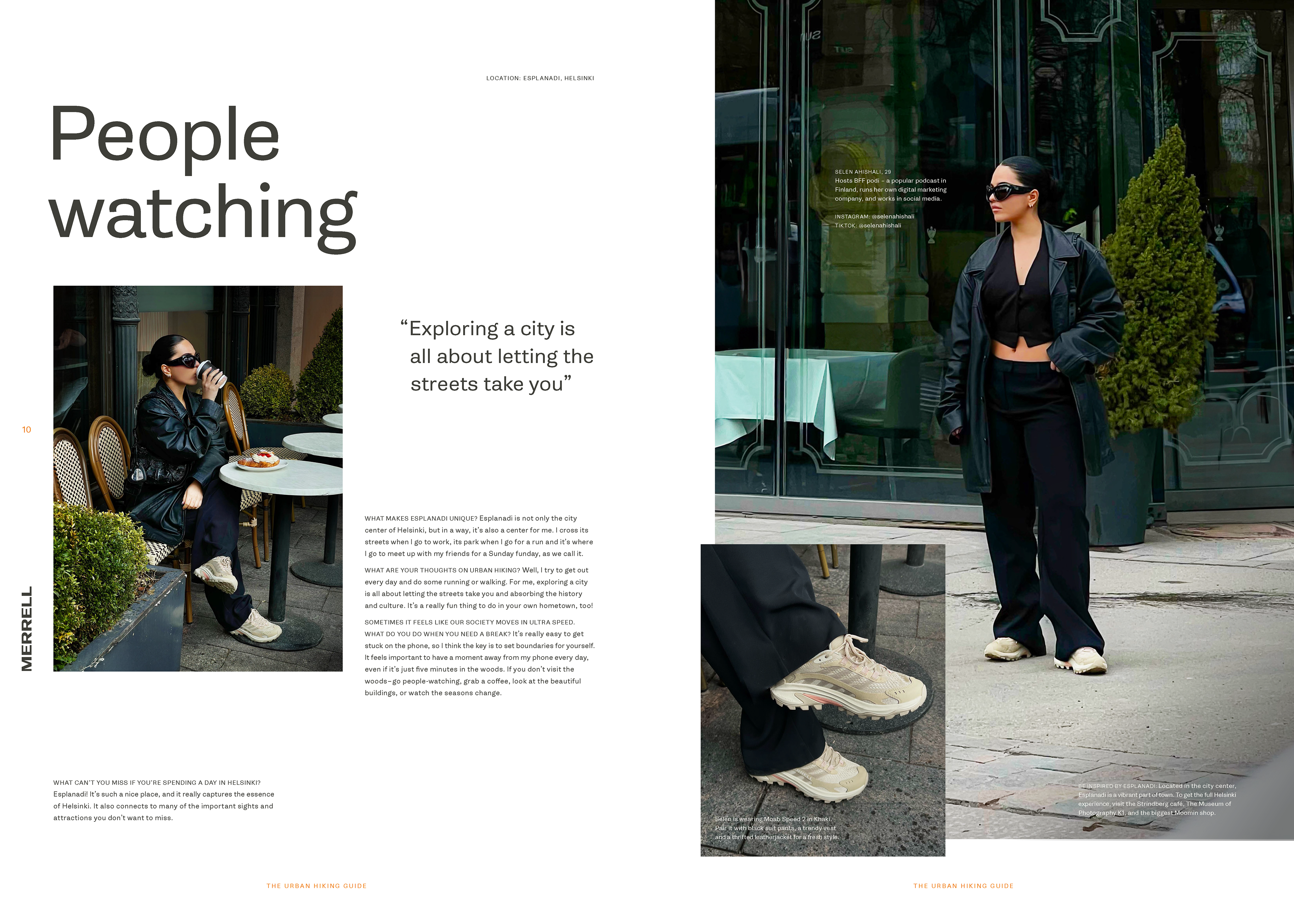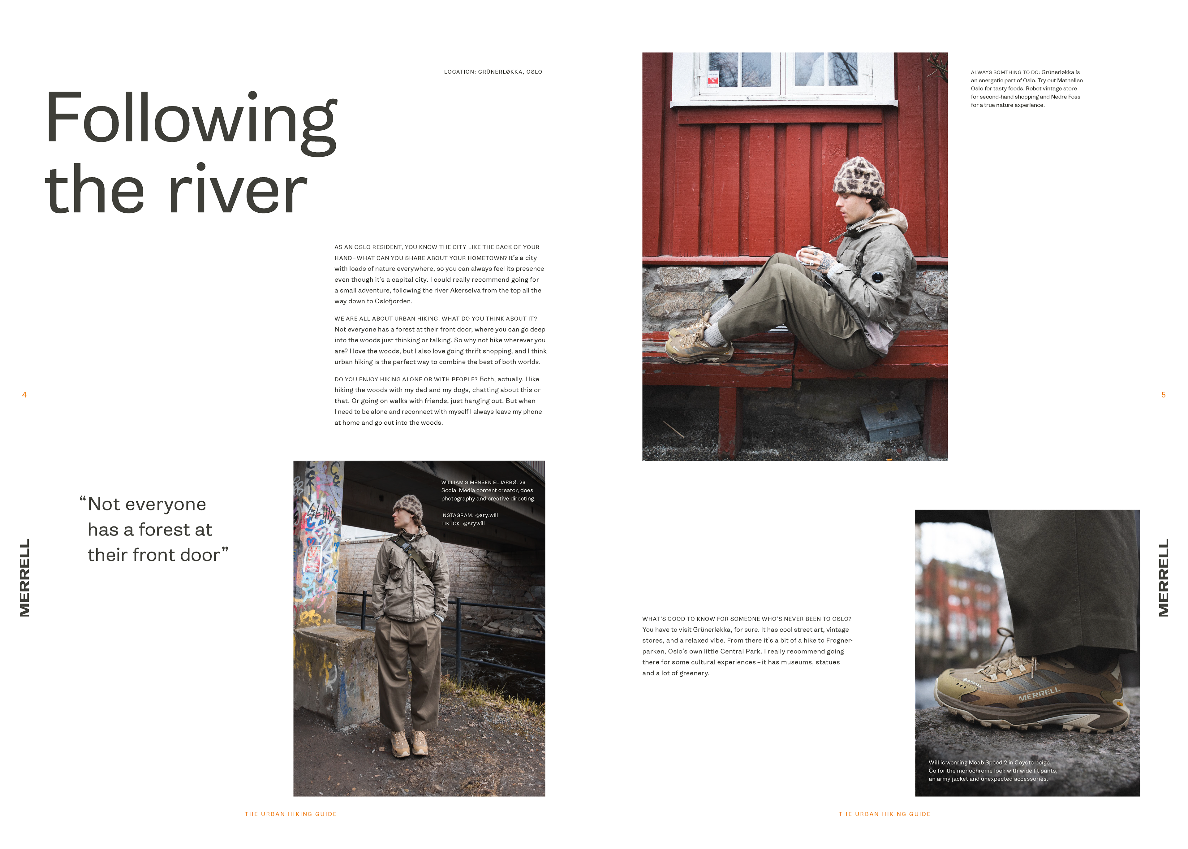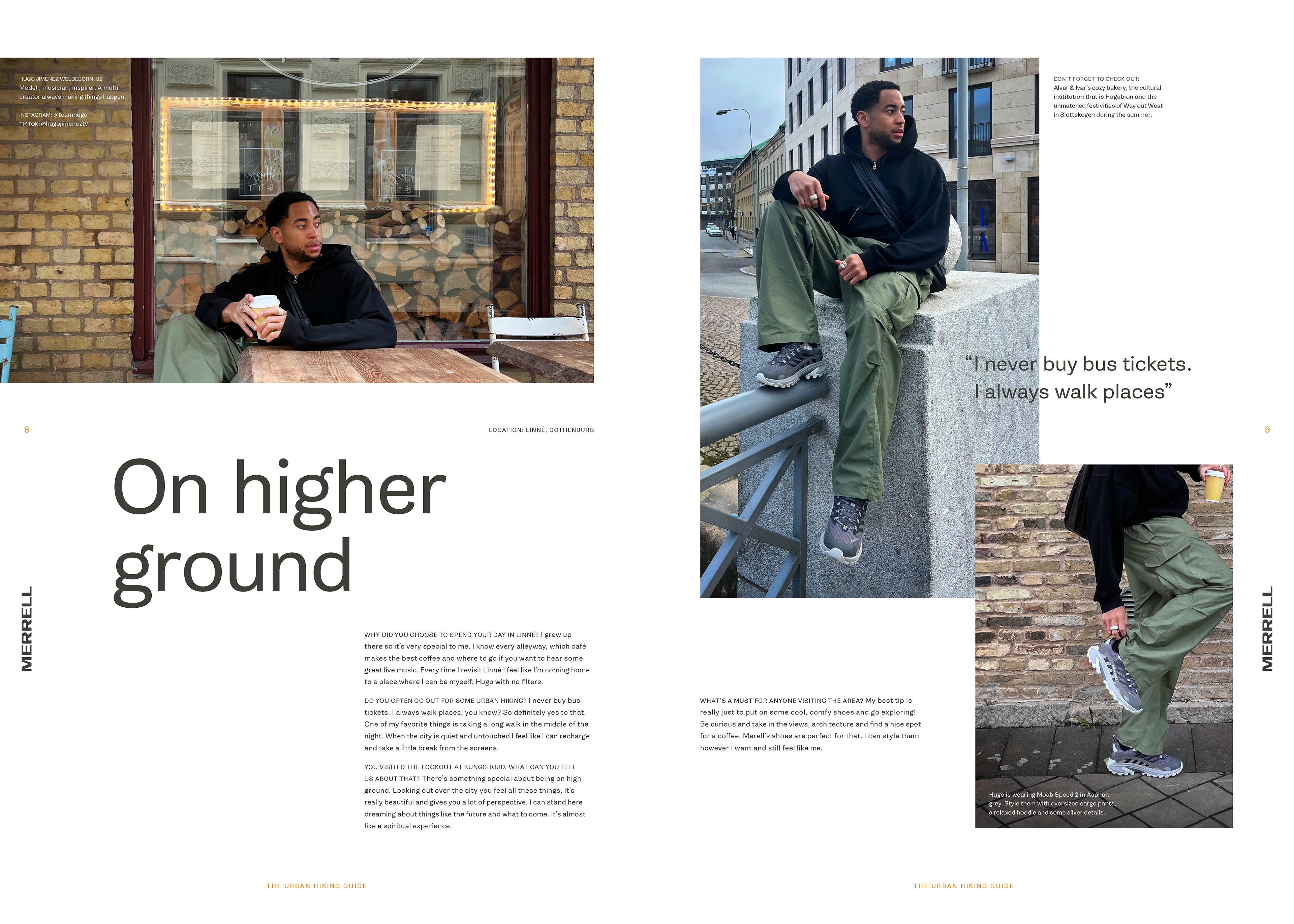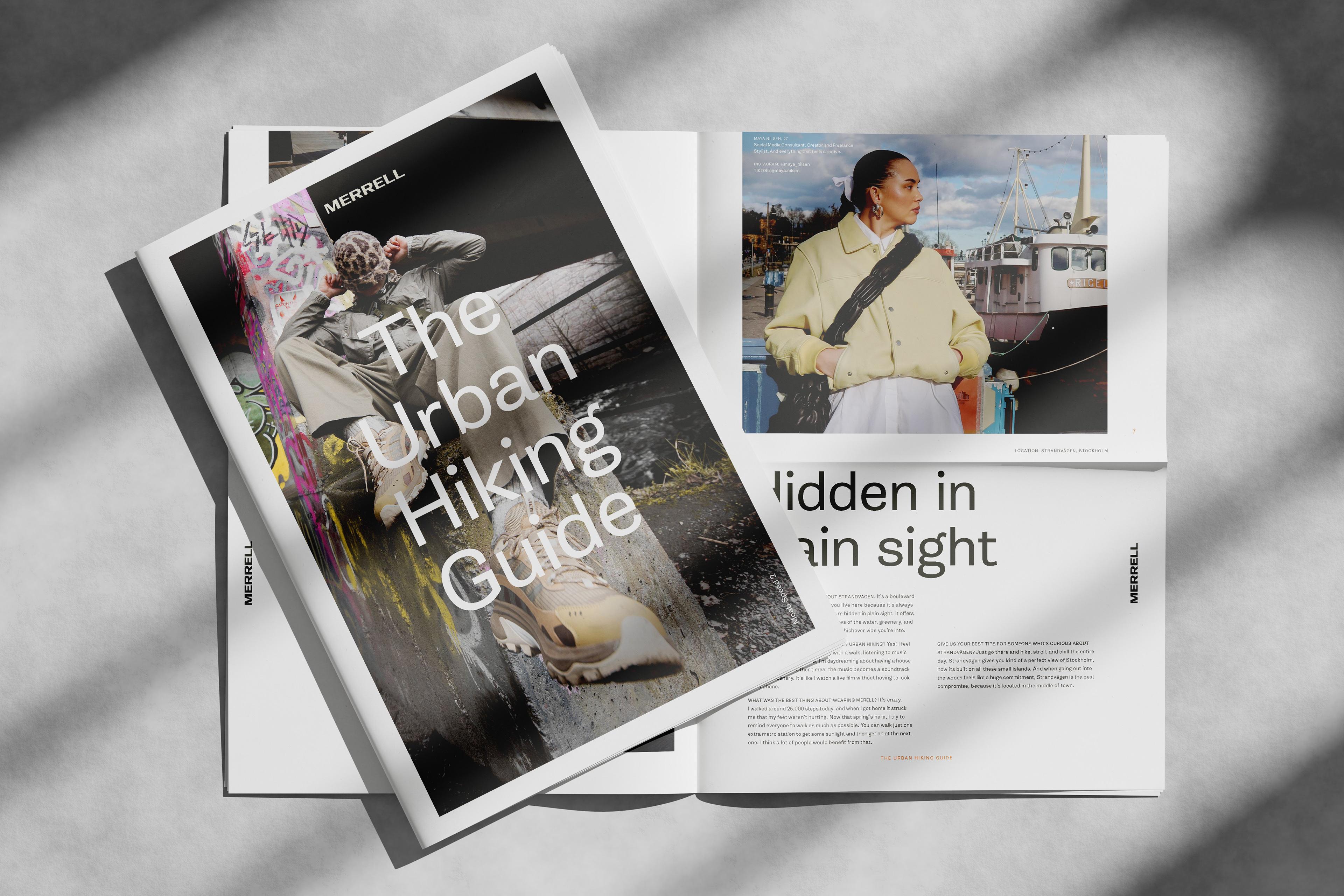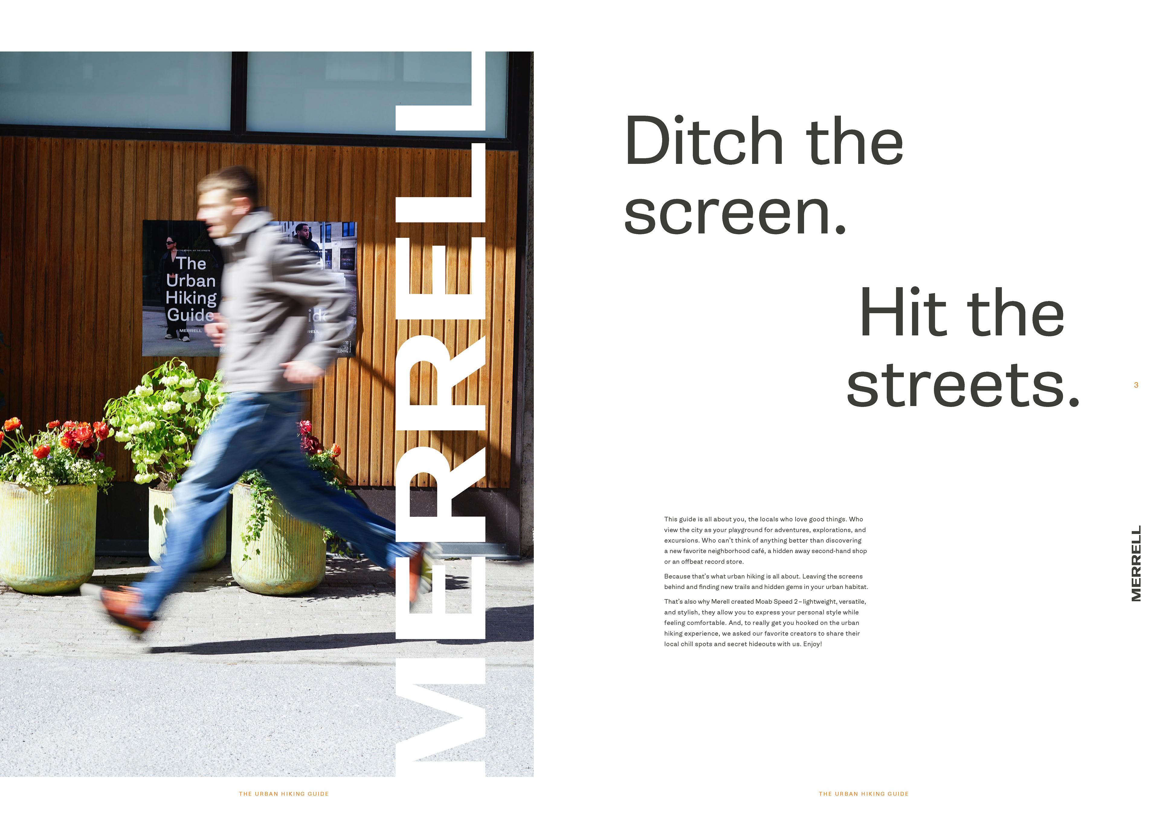 Merrells nya hikingsko, placerades i urbana miljöer för att visa på skons mångsidighet och pratar rakt till målgruppens hjärta: drömmen om lofoten i kombination med ett levande och aktivt stadsliv. Jag fick i uppdrag att skapa en inspirerande, levande och eftertraktansvärd layout till konceptets trycksak.